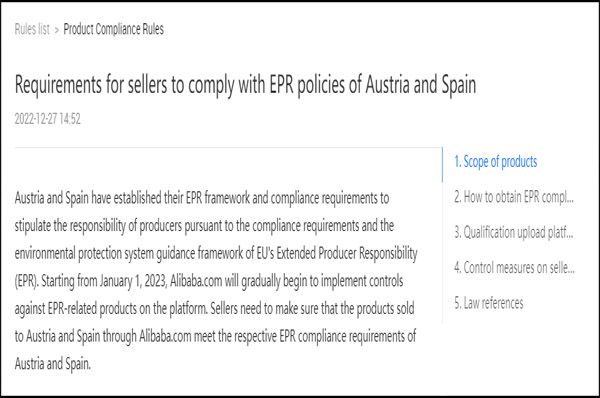 西班牙法令一出臺(tái),速賣通和阿里巴巴國際站電商平臺(tái)就立即響應(yīng)政策,不約而同頒布了EPR強(qiáng)制合規(guī)的要求。
